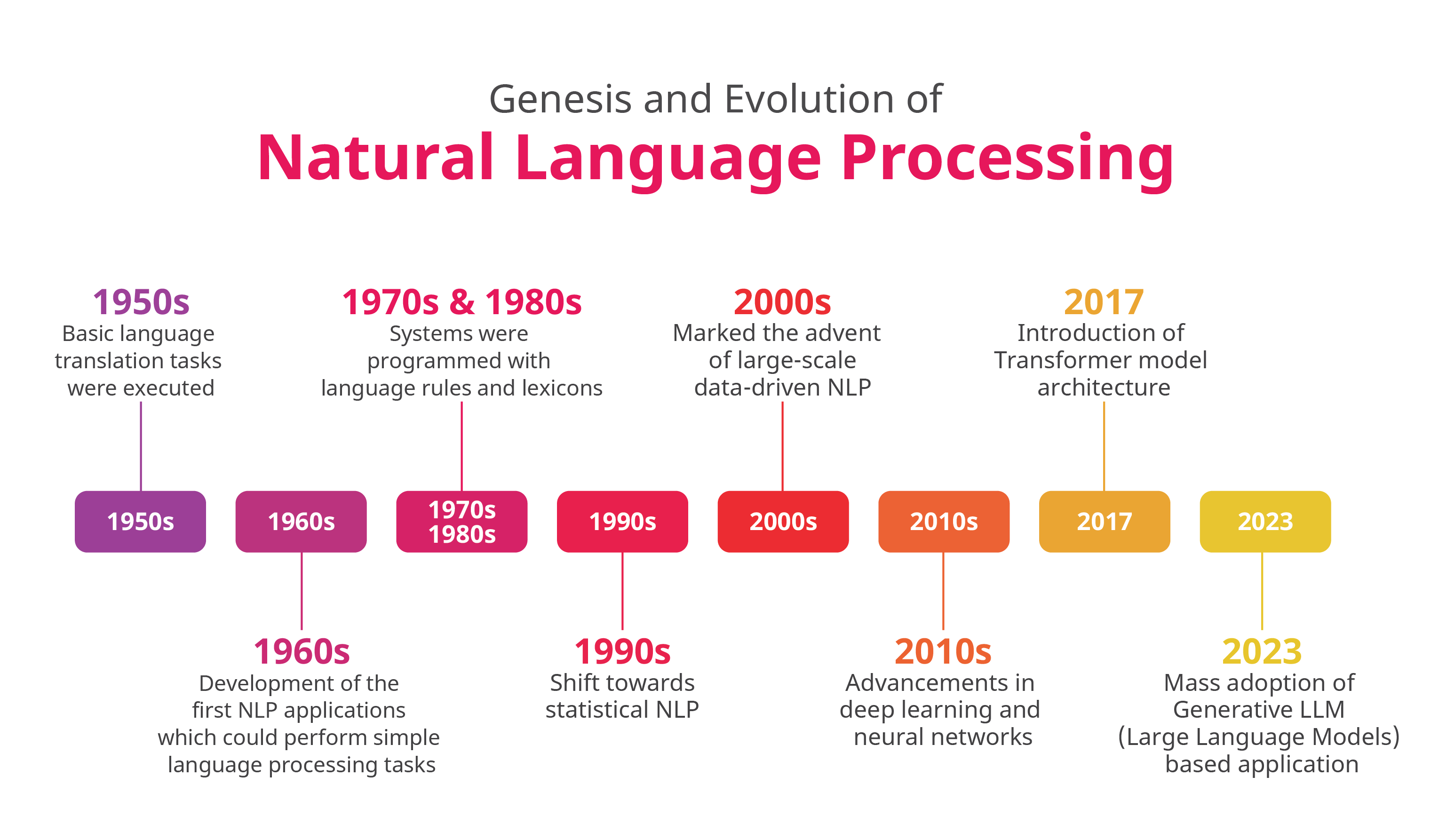 Combina lingüística computacional el modelo de lenguaje humano basado en reglas con modelos estadísticos de aprendizaje automático y de aprendizaje profundo. Todas estas tecnologías permiten que los ordenadores procesen el lenguaje humano para que parezca que comprenden, generan y responden de manera natural y coherente, como si tuvieran una comprensión real del significado y contexto detrás de las palabras y frases. A continuación se presenta una imagen con los principales hitos de la Genesis y Evolución de NLP en (https://commtelnetworks.com)
